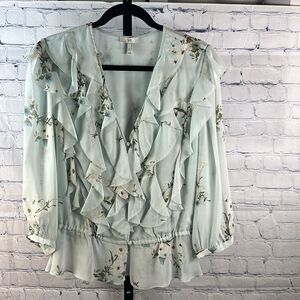🌸 Joie Arleyne Floral Ruffle Blouse | Celadon Blue Sheer Peplum | Size M