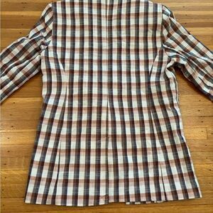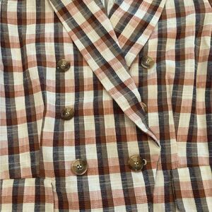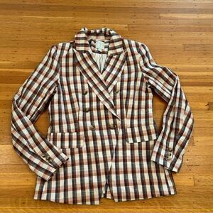 Joie Darryl Striped One Button Blazer. White/pink/orange/black plaid. Collared. 3 buttons on cuffs. 2 pockets. Small slit in back. Shoulder pads. Dry clean. 88% cotton, 11% polyester, 1% spandex. Lining: 98% polyester, 2% spandex. Armpit to armpit 17 1/2 inches. Length 25 1/2 inches. Size XS. Great condition!