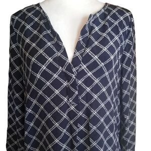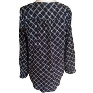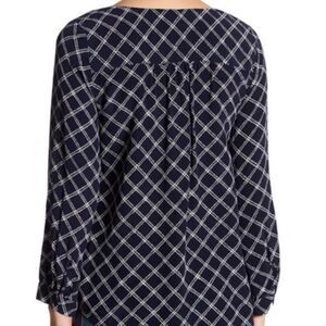 Joie Navy & White Grid Print 100% Silk Pop Over Semi Sheer Blouse Top Size Small