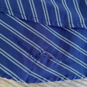 Navy blue skirt with white stripes. Ruffle flounce double layer hemline. Hidden side zip. Great preowned condition with the exception of a patch sewn on the inside of the bottom ruffle to repair rip. Repair is on the back of the skirt. See last photo.