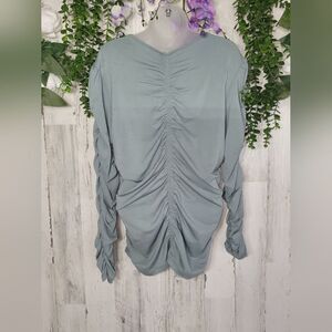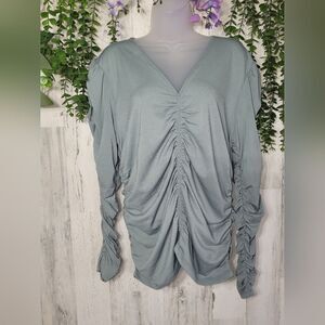 Beautiful shade of green. Long sleeves that are Ruched the length of the arm. Ruching on front and back as well to give a flattering fit. V - neck neckline.