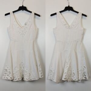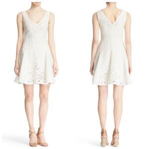 Bold eyelet lace traces the edges of this curve-hugging fit-and-flare dress made from a crisp and cool cotton and linen blend.