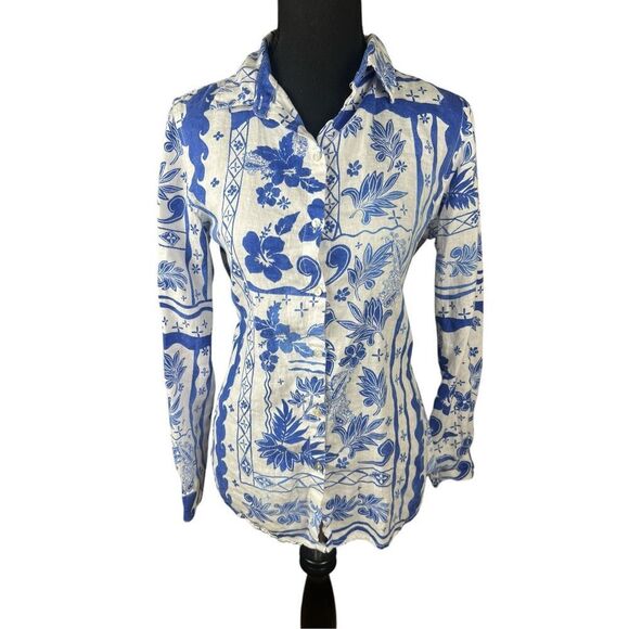 Joie Womens Small 100% Linen Shirt Top Blue White Tropical Floral button up