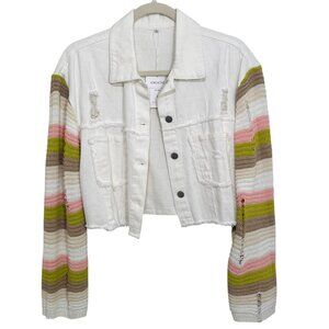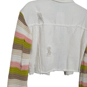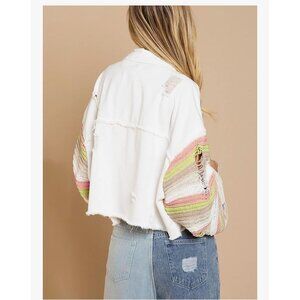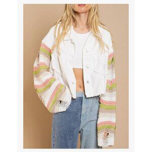 Make a statement with this Joiemont lightweight cropped jean jacket, featuring eye-catching multicolor woven knit sleeves in bold, playful stripes. The white distressed denim body adds a trendy edge, while the cozy sweater sleeves bring unexpected texture and color.