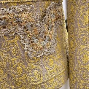 This listing is for a women's blazer jacket by the brand Joimo. It is giving Cher from Clueless vibes. The blazer is a golden yellow, tan, and brown color with a floral tapestry pattern. It features an embellished collar and pockets with beading and crochet lace detail. There are three ornate, golden buttons with light green jewels on the cuffs, and a single matching button on the front closure and has a golden-yellow