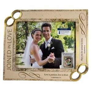 Joined in Love Double Wedding Ring Lighthouse Christian Picture Frame. Holds Up To an 8" x 10" Photo. Large heavy well-made frame. Can be used both in portrait and landscape orientation. Brand New. Comes from a smoke and pet free home. Please see pictures for more details.
