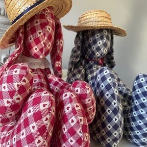 Jointed Bunnies with Straw Hats Folk Country Red & Blue Checked Heart Calico