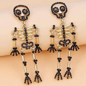 Jointed Skeleton Black Rhinestone Big Chandelier Earrings Gold Crystal