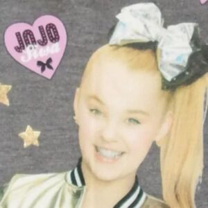 * solid gray base with image of JoJo Siwa on the front, surrounded by gold vinyl frame, pink bows, gold stars, hearts, and JoJo's name at the bottom