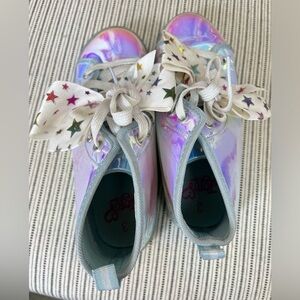 Jojo Siwa rubber shoes. Size 3. Iridescent metallic with rainbow bow. See photos for signs of wear.