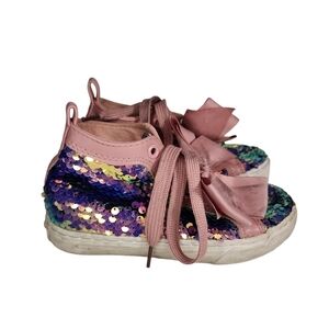 These tennis shoes are a lot of fun! Pink and purple colored sequins allover a canvas base with big, pink grosgrain ribbon bows at the front. These definitely have some wear as you can see on the soles and one of the bows, but they are sturdy and honestly still look really cute on!