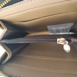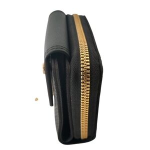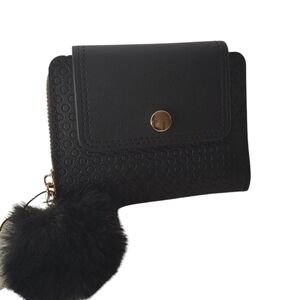 Stylish black wallet with textured design. Features a gold button closure. Includes a cute black pom pom accessory.