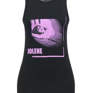 Black and purple cotton Jolen -print tank top from Ann Demeulemeester featuring a jersey knit, a photographic print, a round neck, a sleeveless design, slim-fit silhouette with a scoop neck and side-slit dipped hem.Length 27.3 inches graphic tee glam, rock, grunge, edgy, alternative