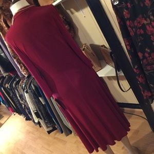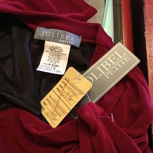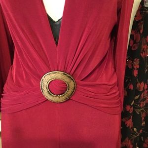 Lovely acetate and spandex slinky knit dress will travel well. Attached buckle worked into x shaped draping. Dress is lined in black. Size 12 p longer sleeve but it's 3/4