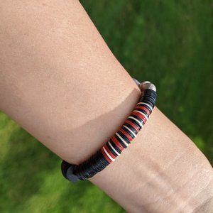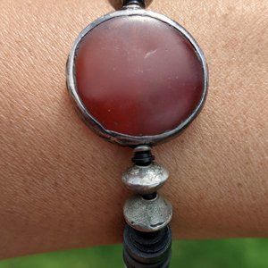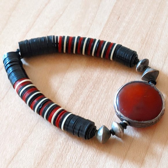 A beautiful handmadeJolie Altman bracelet. A part of the Jolie Altman eclectic collection which juxtaposes the rustic and roughhewn with the rare, fun and colorful with materials sourced from across the globe, including African beads. An Elastic band. Unisex. Her braclets are/ have been sold at Bergdorf Goodman, Anthropoligie.