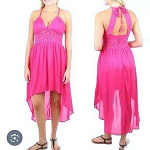 Jolie & Joy hi/low halter dress with embroidery embellishments and bra insert in bright pink.