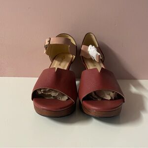 Cute soft faux leather colorblocked heels with a burgundy reddish brown peep toe front, light blush pink ankle strap, and a brown back. The heel has that “wooden” look. New without tags. Never been worn. Heel measurement shown in the photos. Feel free to ask questions or make an offer!