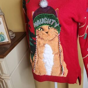 New Jollidays Christmas Naughty Cat sweater women's size XS 100% acrylic P2P 20: Length 25"