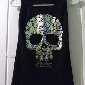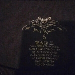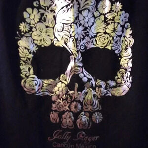 Like new-worn once maybe. No defects. Size small ( armpit to armpit 14" and centerback length 21". Black with silver shine Jolly Roger skull Cancun Mexico.