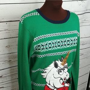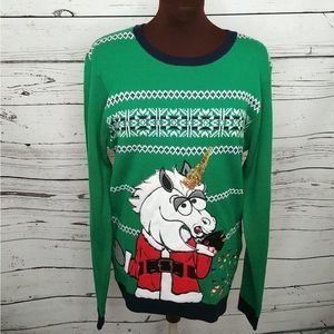 Gently used Jolly Sweater green ugly Christmas sweater with a unicorn eating candy. Size medium. Approx 19 3/4 inches pit to pit. Couple very minor pulls.