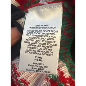 Festive Jolly Sweaters Christmas sweater in bright red, men’s size XL. Made in China from 100% acrylic. Features a playful antlers design — perfect for holiday gatherings, Christmas parties, or “ugly sweater” contests.