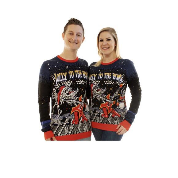 Jolly to the Bone Ugly Christmas Party Sweater Small Men , medium Women Unisex Skeleton GuitarRock and Roll.