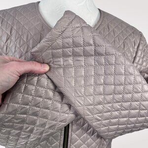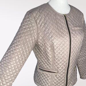 Chic and sleek quilted zip-up jacket. Diamond quilted with a metallic sheen and zippered pockets for a little edge.
