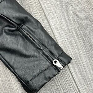 Stylish black jacket with vegan leather sleeves. Features ribbed detailing and zip closure. Perfect for a modern look.