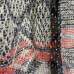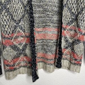 Beautiful cardigan by Jolt. Colorful cardigan sweater in shades of tan, pink, dark blue/black, etc. Bohemian type graphic. No closure. Great go to piece for your wardrobe! All measurements are approximate and taken flat.