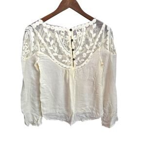 Jolt Cream Long Sleeve Blouse with Embroidered Sheer Lace Yoke & Back Button Detail Small