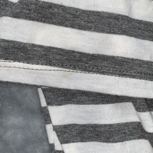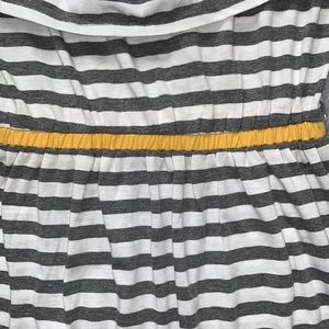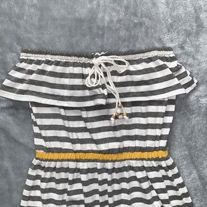 Jolt brand strapless gray and white dress originally purchased at Nordstrom. Elastic ruffle trim top and elastic waist. Faux drawstring detail at chest with wooden beads. Has a small stain on front (see close up photo) that is not noticeable at all when wearing. Otherwise looks like new with no noticeable wear. Dress is slightly sheer in the white stripe sections. Measurements laying flat: 12 in across top. 11 in across waist. 24.5 in long from top to hem.