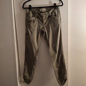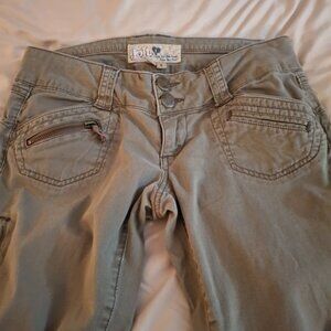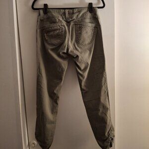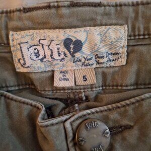 Jolt junior women's Olive green cargo pants with button details. Ideal for everyday style. Size 5. waist side to side measures 15 inches. Length 36 inches. Inseam 27 inches.