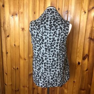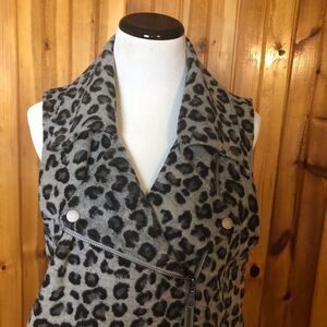 Jolt Leopard Print Moto Style Vest. Wool blend gray and black print. 2 front pockets and 2 faux zipper pockets. Front zipper closure. EUC. Size medium. Measures chest 38”, length 25”. Front