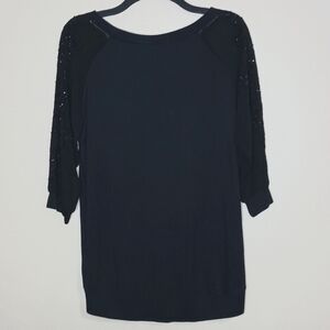 NWT. Casual, yet classy black banded shirt with sheer 3/4 banded sleeves adorned with black beading. 95% rayon, 5% spandex, trim is 100% polyester. Hand wash, line dry. Smoke free home.