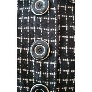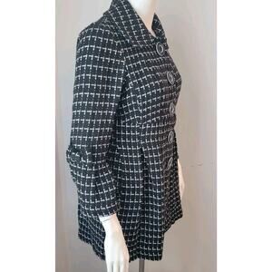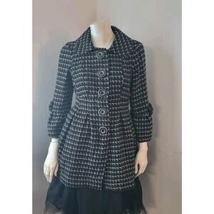 Jolt Womans Sz. M Jacket Coat Shaket Large Button Black/White Bow Detail. This is great peacoat style jacket. Gingham pattern. Feminine look with bows on each sleeve and in the middle of the back. Great for maternity wear as well because the bottom of this can expand out over the belly. Great for fall. Acylic blend. Not lined.