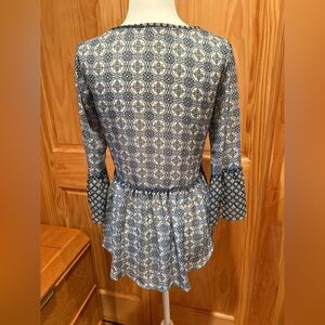 Jolt Women's Blue Tie Neck 3/4 Bell Sleeve Peasant Top. Featuring blue and gold patterned fabric, A tie-neck design, 3/4 length bell sleeves.
