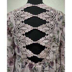 Jolt semi sheer NWT floral pattern top with crochet lace back detail. Slightly bell sleeves with lace inserts. Pretty feminine top. Empire waist look.