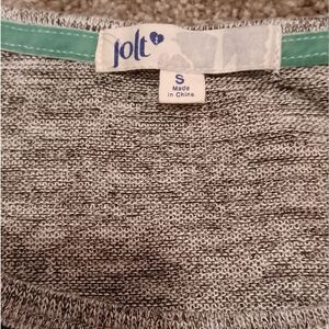 Jolt top with heather gray sleeves and back, black and dark gray lace embroidery, and sheer white front. size Small.