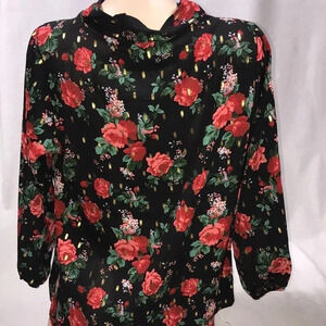 Black with bright red flower and gold foil print with 3/4 sleeves and peep hole neck tie.