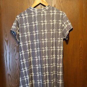 From TJ Maxx, flow-y comfortable fabric, easy to wash and wear. Around knee length. Measured in front, top to bottom, 36 inches.
