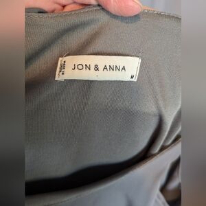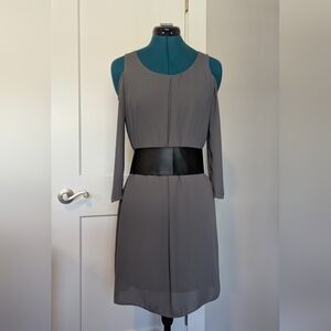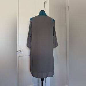 Jon & Anna grey chiffon A-line dress with a scoop neckline and cold-shoulder 3/4 length sleeves. The grey is on the warmer side with a hint of taupe. This chiffon dress is fully lined - no need for a slip or layers. This delicate, feminine dress is versatile and will look great with some boots in the fall, or some espadrilles in the spring or summer.