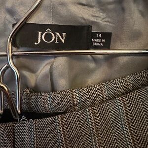 Jon Brown Tweed w/Tan & Blue Stripe Career Pantsuit with beaded trim. Jacket and pants are lined. Size 14. See photos for fabric content and washing instructions. Pet free/Smoke Free Home.