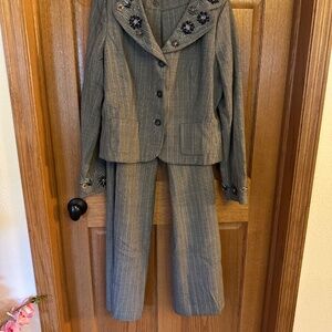 Jon Brown Tweed w/Tan & Blue Stripe Career Pantsuit with beaded trim. Size 14.
