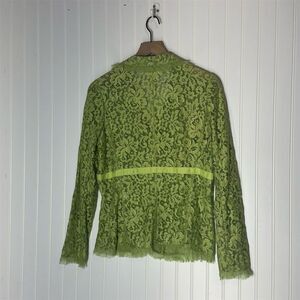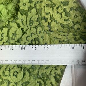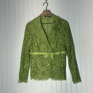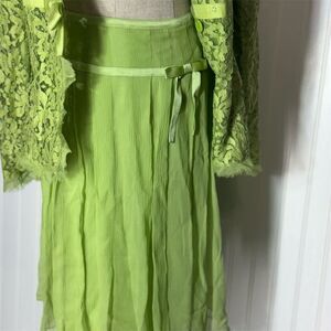 Gorgeous vintage-inspired formalwear set from Jon. The top is a lace blazer (size 12) with floral appliqué detail, sheer construction, and a built-in ribbon belt. Paired with a fully lined pleated chiffon silk skirt (size 14) featuring a satin ribbon waist detail. This standout lime green ensemble is perfect for formal events, weddings, or elevated vintage styling.