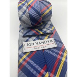 Handcrafted in Holland, the Jon VanDyk Necktie features a classic plaid pattern in gray, yellow, red, and blue. This high-quality accessory will add a stylish touch to any outfit.