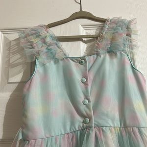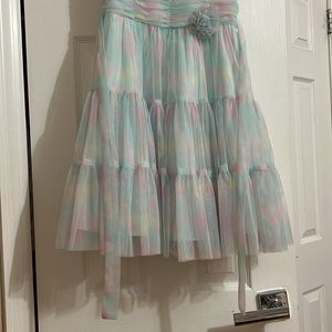 This dress is beautiful. It is size 10. It is very colorful and made out of tulle. It is barely used. (Only worn once)