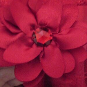 Lace pattern to the dress with flowers to complement the dress. Cap sleeves, and buttons in the back, sash tie. On the satin sash tie is a flower iwith a gemstone in the center in red. High quality and fance Perfect for Holiday wear. Slight sparkle the dress pattern. Stunning and your little girl willfeel special in this one!