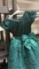 Elegant teal dress with velvet top and lace skirt. Satin bow accent. Perfect for special occasions.