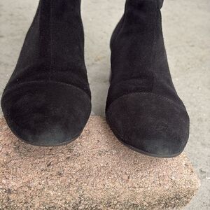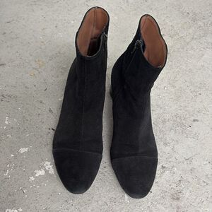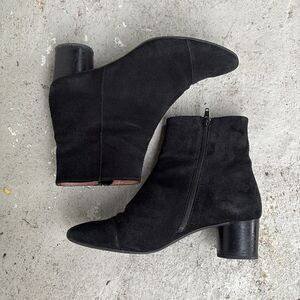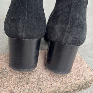 Super cute suede ankle boots but check out the pictures. They need cleanup on the Tow and the soles have where. Shaft height is 5.5 inches shaft width is almost 5 inches heel height is 2 inches.