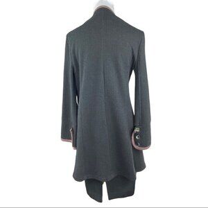 Jacket: Preloved hook and eye closure, hidden front pockets, notch lapel, 3 button long sleeves, accent chest/sleeves, very long jacket and lightweight.